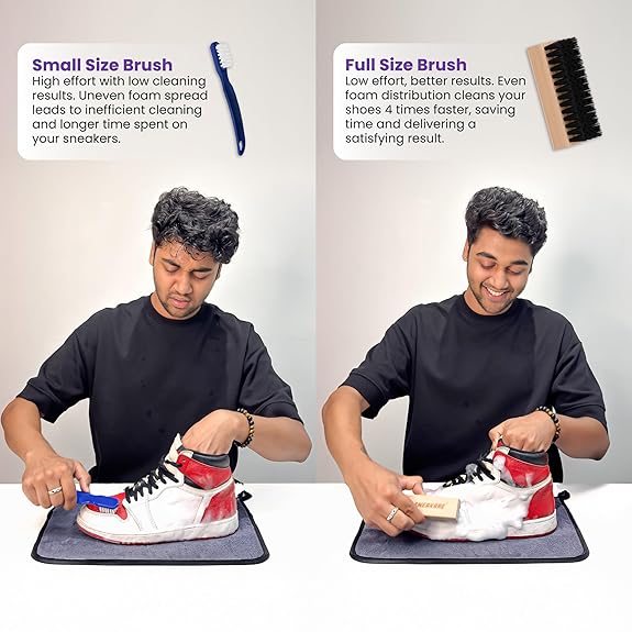 • How to Use: Dry brush the shoe to remove excess dust on the surface. Pump the foam evenly on the medium brush, & scrub the affected areas thoroughly. Wipe the foam on the shoe using a microfiber towel. Allow the shoe to dry for 3-4 hours in a well ventilated area.